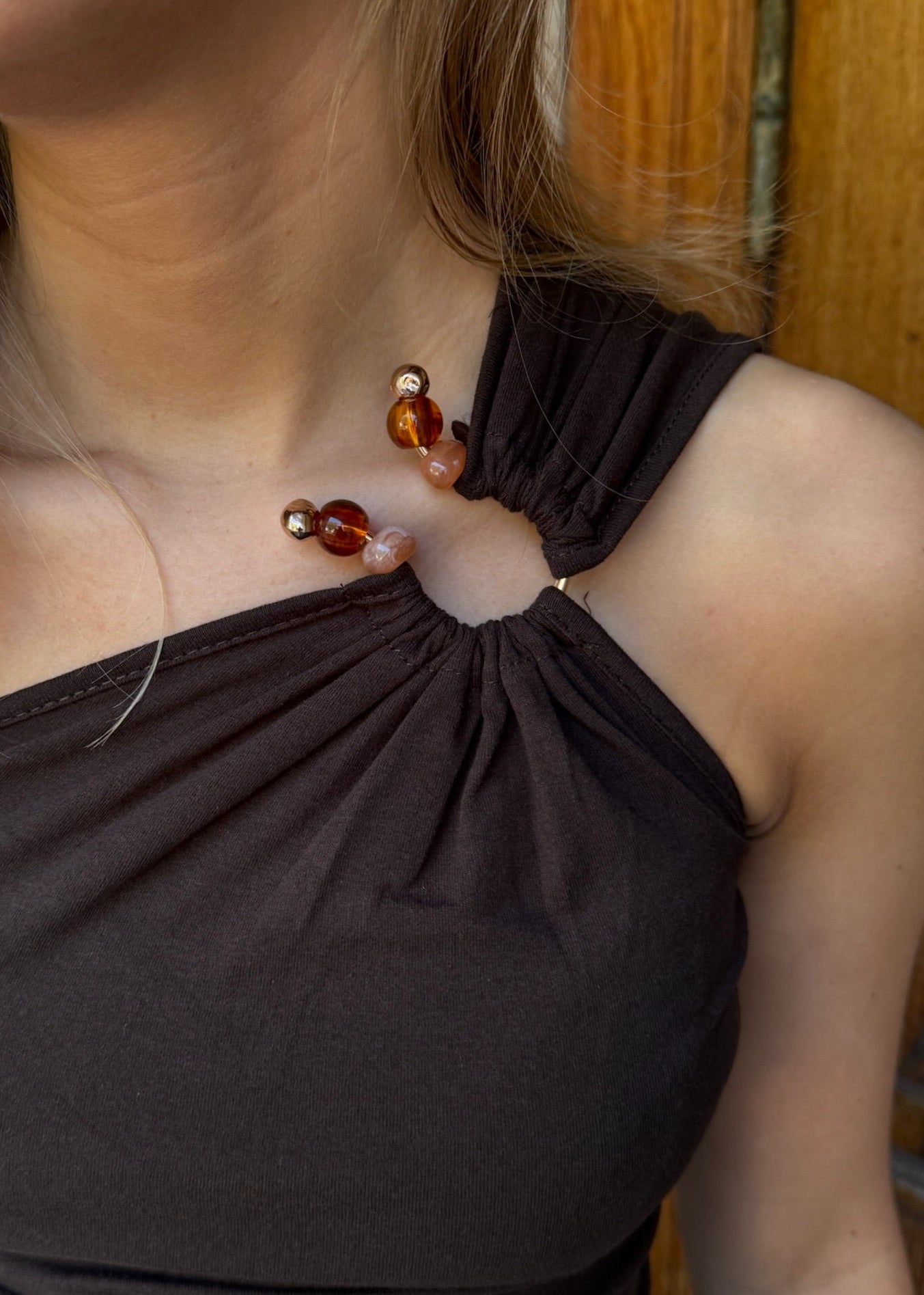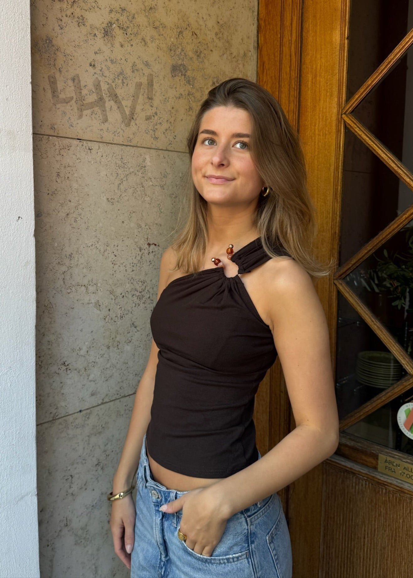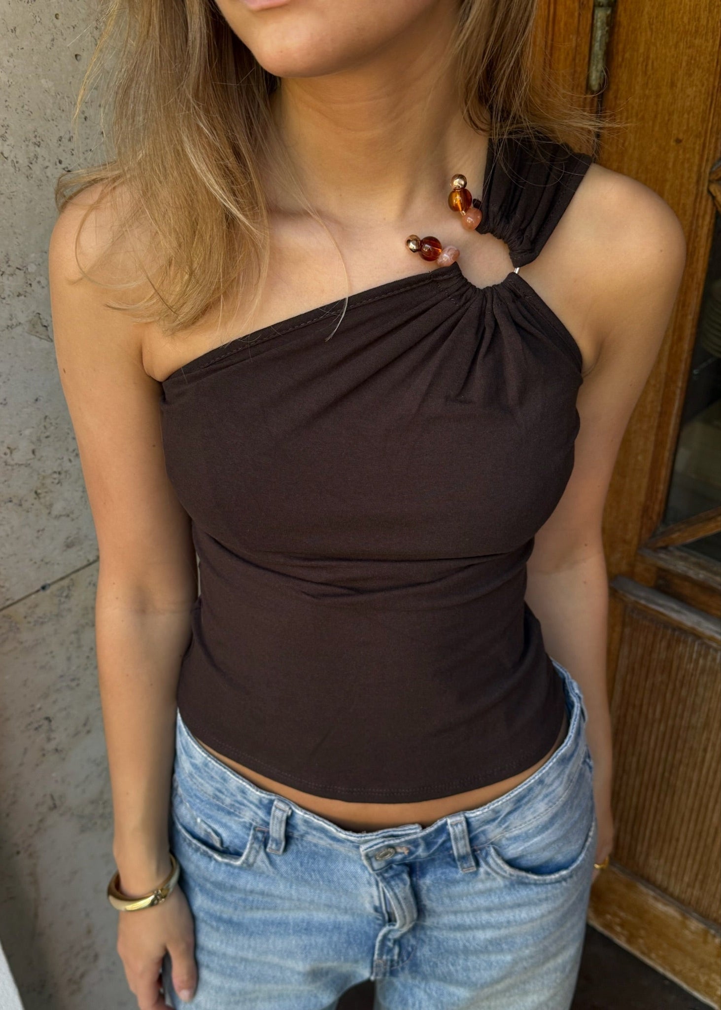 En tætsiddende top med et stilrent one shoulder-design, fremstillet i 100% bomuld. Toppen har perledetaljer ved brystet, som tilføjer et dekorativt element.