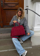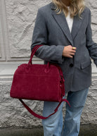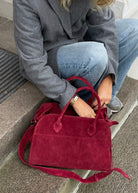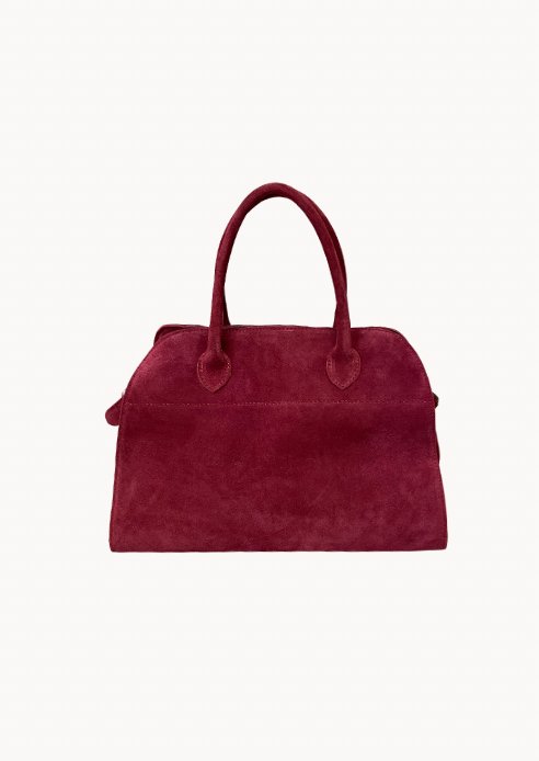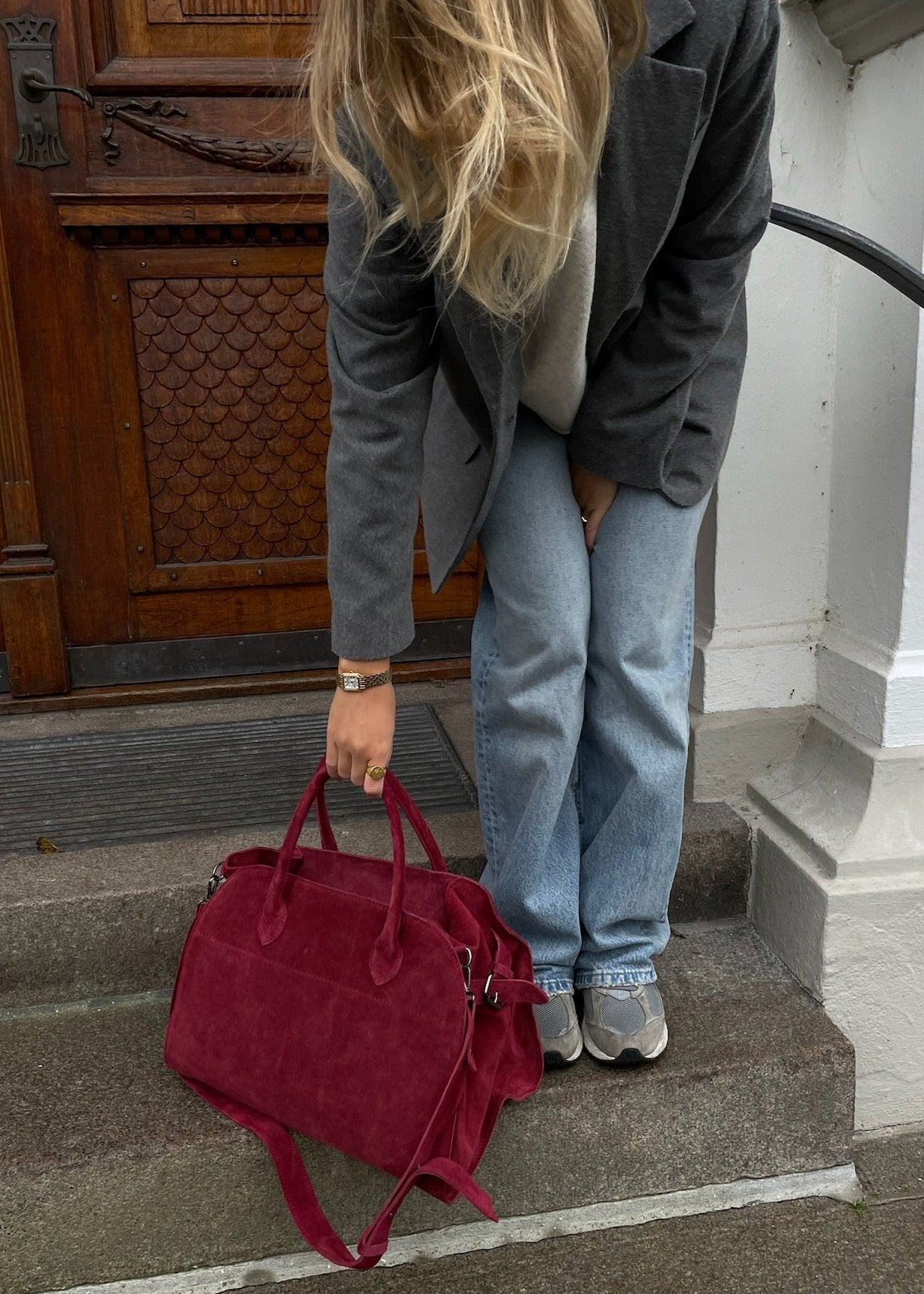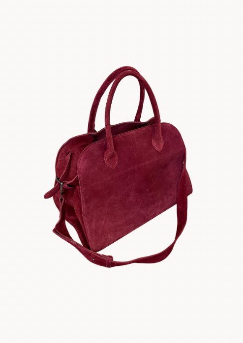 Taske fremstillet i 100% ægte ruskind. Modellen har både håndtag og en aftagelig rem, så den kan bæres i hånden eller over skulderen. Tasken har ét stort hovedrum med plads til en 13-tommer computer samt bøger og andre ejendele. Indvendigt findes lommer både med og uden lynlås.
