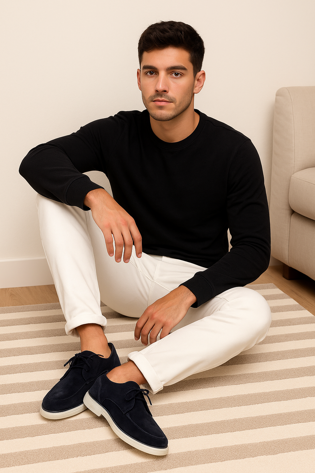 Mokkasiner til mænd fremstillet i blødt ruskind med snørelukning. Modellen har en fleksibel sål og et enkelt design, som gør skoene velegnede til både indendørs brug og hverdagsaktiviteter.