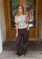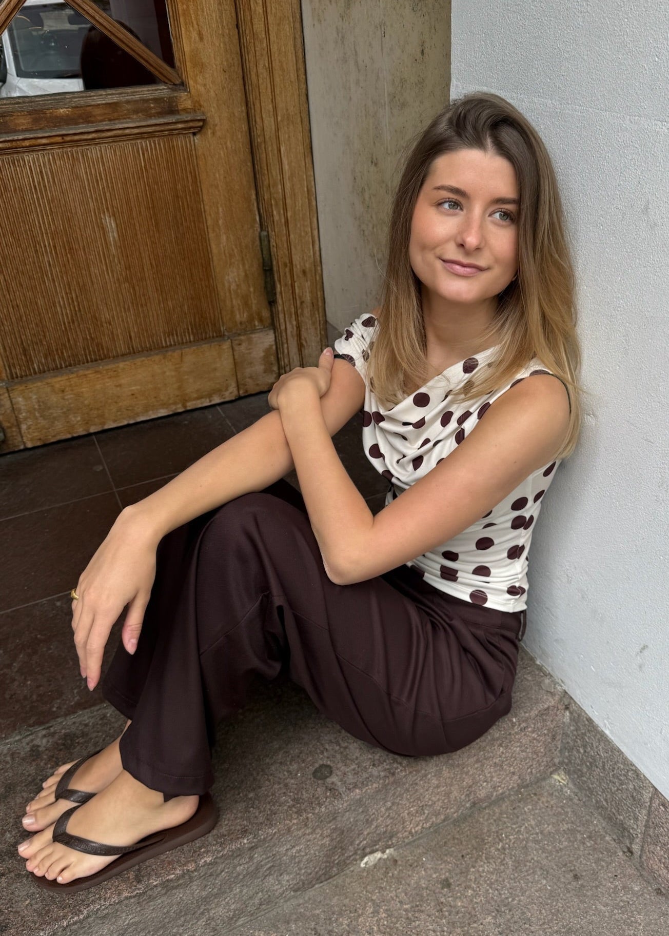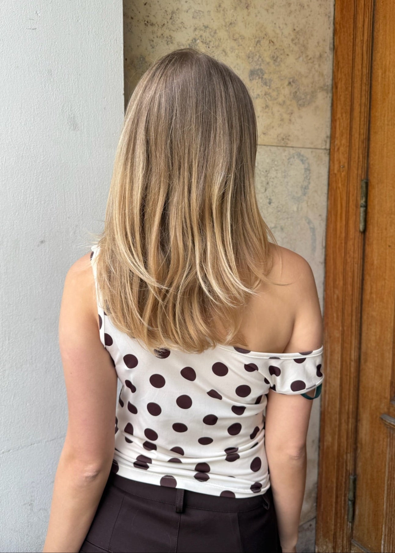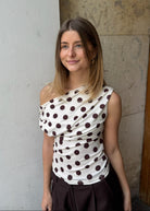 En tætsiddende top med draperet design og et asymmetrisk skuldersnit. Polkaprikkerne giver et klassisk og tidløst mønster, mens den tætte pasform fremhæver silhouetten.